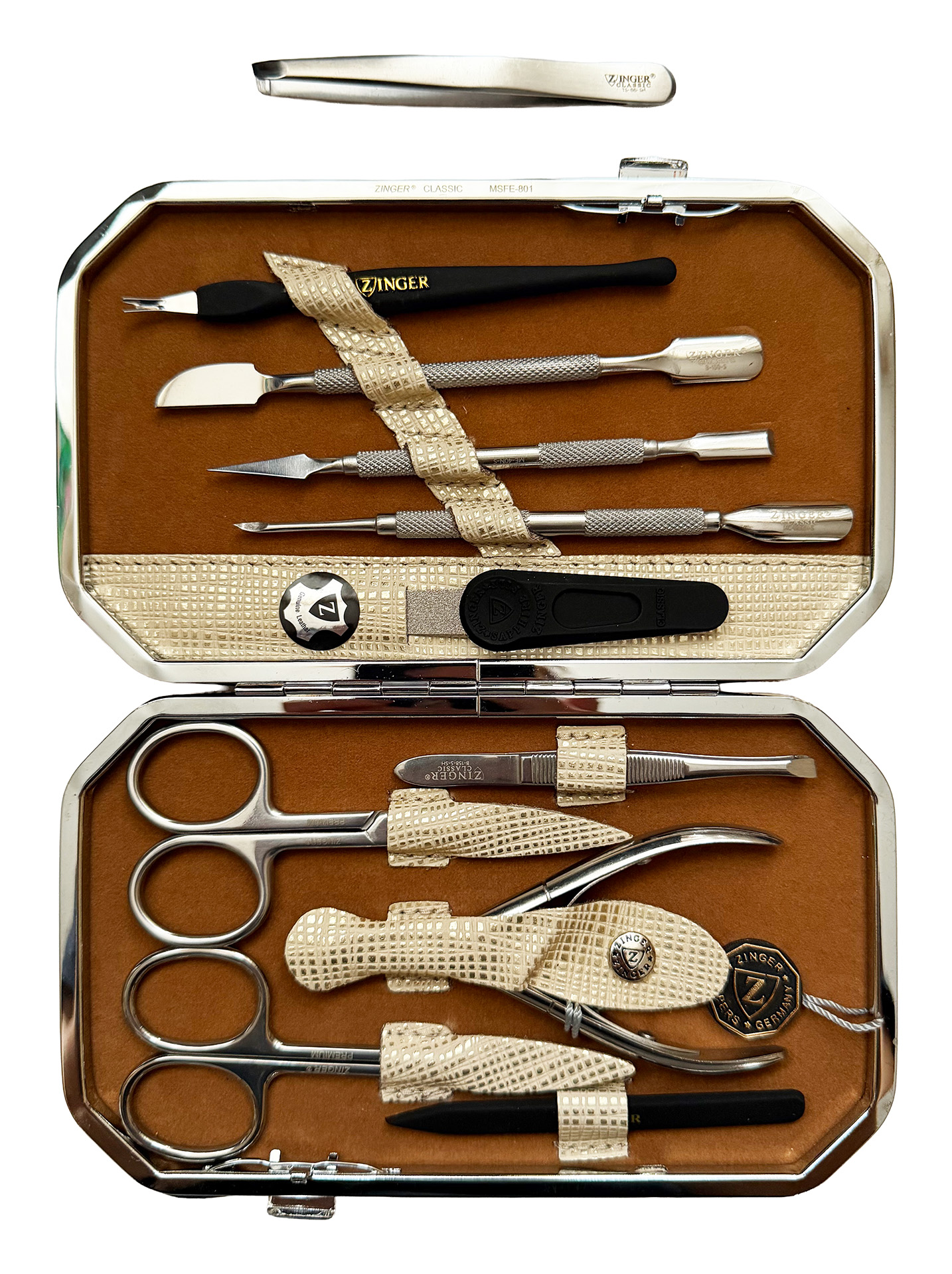 Маникюрный набор c инструментами Premium-качества ZINGER MSFE-801-3 S. Футляр изготовлен из натуральной кожи. Внутренняя отделка футляра - мягкий велюр, имитация замши. Подарочная коробка с логотипом, внутри отделана бархатной бумагой. В набор входят 10 предметов: кусачки для кутикулы, 2 ножницы, пинцет скошенный, пинцет пластиковый, пилка алмазная, 3 металлических пушера, триммер. Отдельно - подарок - пинцет в контейнере.